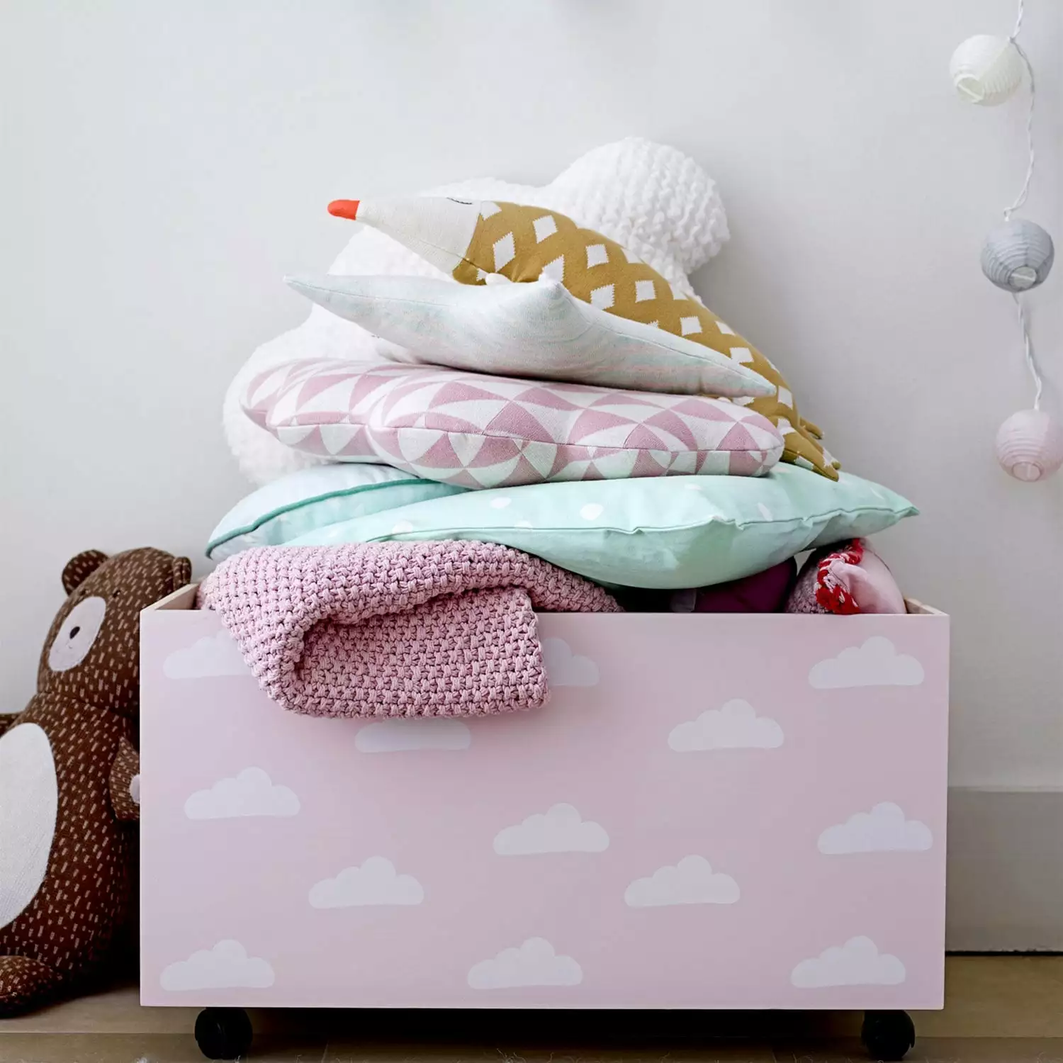 Das Kissen besteht aus Polyester, wodurch es langlebig und leicht zu waschen ist. Perfekt für das Kinderzimmer!